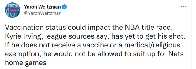 关于欧文是否接种疫苗这件事,其实尚未有定论。福布斯记者Yaron Weitzman表示,欧文还没接种新冠疫苗,但篮网记者Brian Lewis表示,欧文在当地时间9月12日去观看了一场WNBA比赛,而他所坐的位置有严格的规定,必须是完全接种疫苗的人才能坐在那儿。