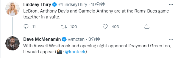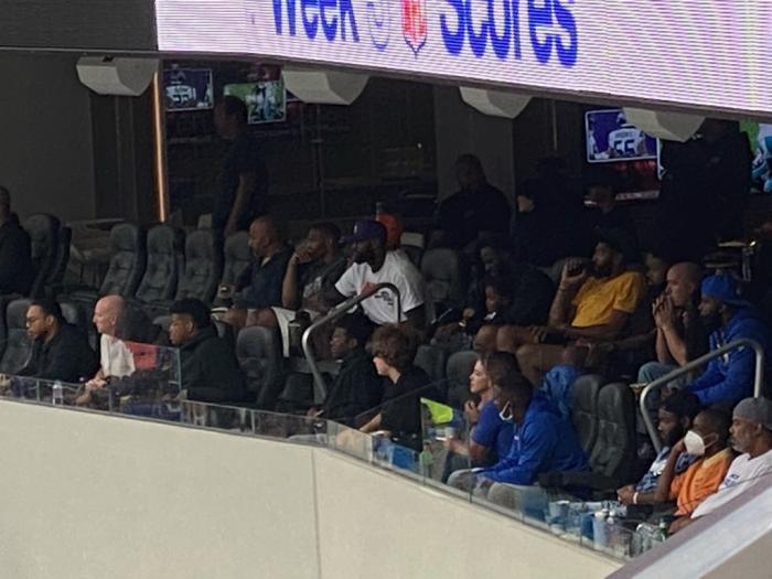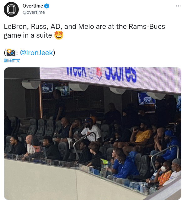 JRS直播网9月27日讯 ,湖人四大巨星现身NFL包厢看比赛,詹姆斯、威少、浓眉和安东尼一起观看公羊队和海盗队的比赛,勇士球星德拉蒙德-格林也和他们在一起。