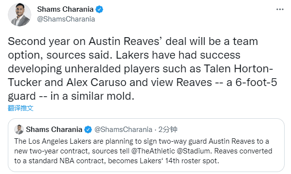 根据报道,里夫斯的合同第二年为球队选项,shams还表示湖人已经培养了像霍顿-塔克和卡鲁索这样的不起眼的球员,现在湖人打算培养里夫斯;今年休赛期,卡鲁索和公牛签下4年3700万美元大合同,霍顿-塔克则是和湖人续签3年3200万美元新合同。