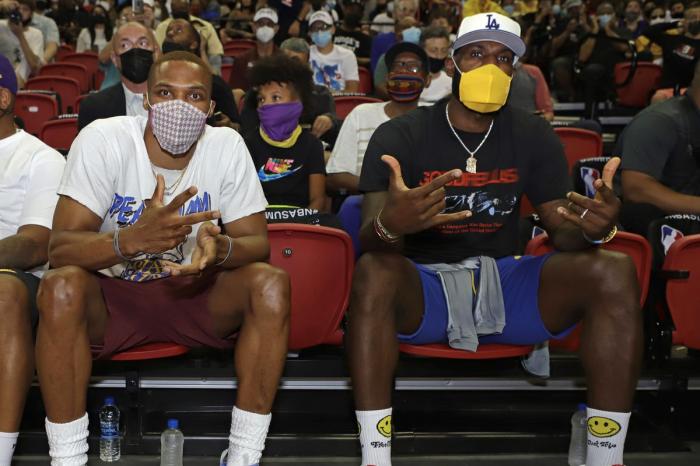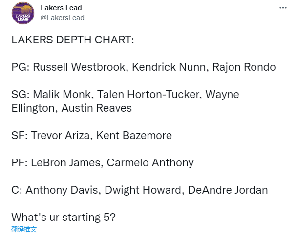 湖人14位正式合同球员分别是詹姆斯、浓眉、威少、阿里扎、艾灵顿、霍华德、朗多、安东尼、蒙克、纳恩、塔克、贝兹莫尔、小乔丹和里夫斯,这将是湖人新赛季冲冠的轮换阵容;那么你认为哪五人会是湖人首发呢?1号位威少、4号位詹姆斯和5号位浓眉。
