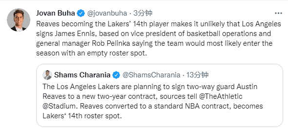 恭喜23岁里夫斯拿到湖人保障合同,今年落选秀从双向合同转为正式合同,成为湖人新赛季冲冠的第14名正式球员;不过里夫斯转正意味着湖人不太可能签下恩尼斯,因为佩林卡计划空缺第15人名额,为赛季中期引援做准备。