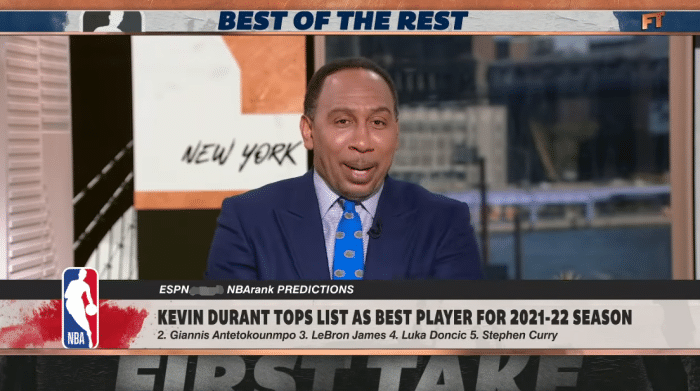 JRS直播网9月26日讯 ,权威体育媒体ESPN此前评选了新赛季百大球员,其中篮网巨星杜兰特力压上赛季FMVP字母哥排在第一。而近日,ESPN王牌评论员斯蒂芬A史密斯在节目中谈到了杜兰特与字母哥。