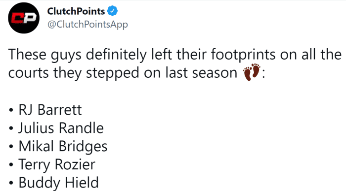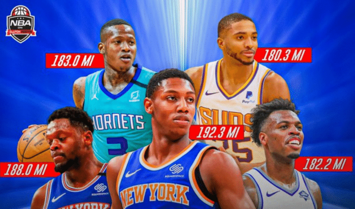 RJ巴雷特上赛季的跑动距离达到192.3英里(换算309.6公里)高居全联盟第一,而他的队友兰德尔则是以302.7公里位居第2,黄蜂后卫罗齐尔294.6公里排第三,国王神射手希尔德293.3公里第四,而太阳前锋布里奇斯以290.3公里位列第五。