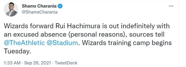 JRS直播网9月26日讯 ,据名记查拉尼亚报道,多方消息透露,奇才前锋八村垒因个人原因将无限期缺阵,奇才官方也更新消息,八村垒至少缺席训练营初期阶段,并表示在适当时候会更新他的动态。至于八村垒缺席的具体原因,并未被透露。