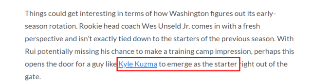 美媒指出,八村垒的缺席,有可能让新援库兹马升为首发。从湖人来到奇才,库兹马本就有望获得更多的出场时间,现在来看,他甚至可能在赛季揭幕战中直接首发登场。加盟奇才后,库兹马第一时间表达了联手比尔的兴奋,休赛期,他也很努力训练,大家认为库兹马会在新赛季迎来爆发吗?