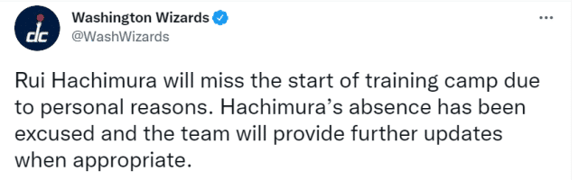 据悉,奇才对八村垒寄予厚望,特别是威少离队后,他有望在队内扮演更重要的角色。2020-21赛季,八村垒场均13.8分5.5篮板,投篮命中率47.8%。值得一提的是八村垒上赛季开始时也缺席了一段时间,当时的原因是结膜炎。5场季后赛,八村垒场均14.8分7.2篮板,投篮命中率61.7%,三分命中率60%,状态比常规赛更好。