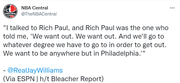 NBA记者JayWilliams透露,我跟西蒙斯的经纪人里奇-保罗聊过,他告诉我,他们想离开76人,他们想离开这里。为了离开费城,我们会竭尽所能的去做到一切我们所能做的事情,除了76人,他们想去任何一支球队。