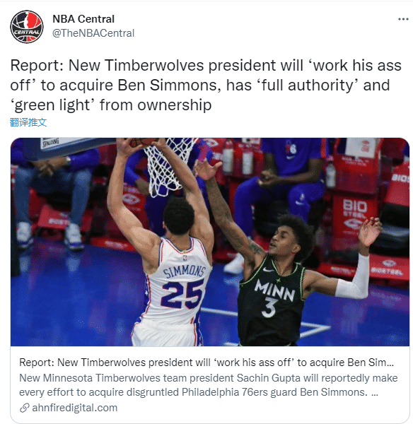 76人劝说西蒙斯的计划已经泡汤,因为西蒙斯不仅拒绝与76人管理层沟通,而且拒绝与恩比德等人会面;目前76人正在和其他球队进行谈判,但他们还没有收到满意的报价,现在森林狼是西蒙斯的狂热追求者,森林狼新高管吉普塔已经得到老板的授权,将全力以赴去促成西蒙斯的交易,可以用任何他认为合理的资产去交易。