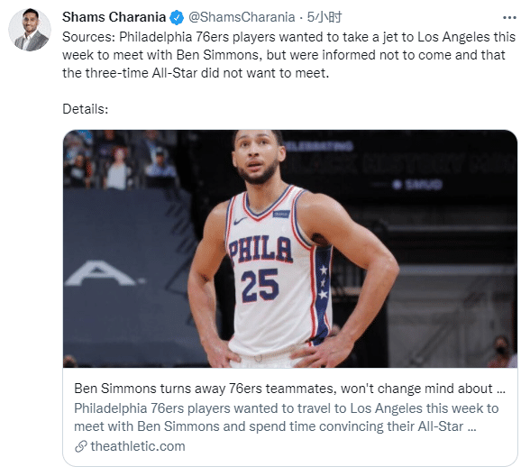 恩比德、哈里斯、塞布尔等76人球员想飞往洛杉矶与西蒙斯见面,目的是想要尝试说服西蒙斯归队,但西蒙斯礼貌地拒绝了他们,让他们不要浪费时间,因为他不会改变自己的离队想法;shams还表示:西蒙斯已经是身在曹营心在汉,无论他是否还会出现在费城,他都不可能再为费城效忠了。