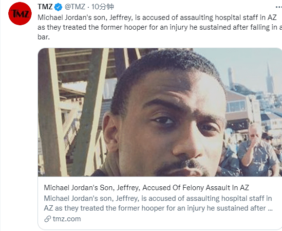 据美媒TMZ报道,迈克尔-乔丹32岁的儿子杰弗里-乔丹被指控于周五晚上袭击亚利桑那州一家医院的工作人员,当时他正在医院接受治疗,因为他在酒吧受伤。