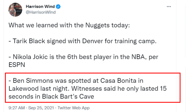 JRS直播网9月25日讯 ,据掘金记者Harrion Wind报道,有人昨晚在丹佛的莱克伍德Casa Bonita餐厅偶遇本-西蒙斯,他短暂停留后离开。此前,美媒报道称掘金有兴趣得到西蒙斯,如今,西蒙斯现身丹佛引人遐想。