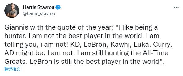 字母哥则认为联盟第一仍是詹姆斯“我不是目前最好的球员,我不是。杜兰特、詹姆斯、小卡、东契奇、库里和AD,你说他们其中任何一个人是我都可以接受,但我肯定不是,我仍在朝‘最好的球员之一’努力,我认为詹姆斯是目前最好的球员。”关于这个问题,每个人可能都有自己的看法,其实谁是第一不重要,重要的还是看谁能带队夺冠!