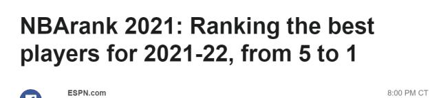 JRS直播网9月25日讯,近日《体育画报》和ESPN都排出了新赛季的百大球星,其中前十的排名最引人关注,看一下两大美媒给出的排名!