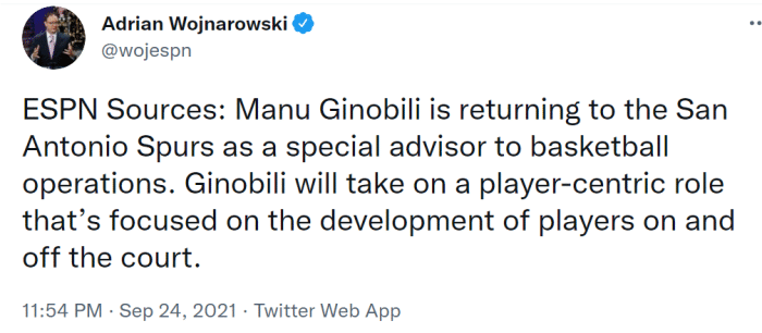 JRS直播网9月25日讯,圣安东尼奥马刺官方宣布,马努-吉诺比利将加入马刺管理层,担任篮球运营部的特别顾问。44岁的妖刀,终于正式回归马刺大家庭。ESPN报道称,吉诺比利的工作将以球员为中心,关注马刺年轻球员场内场外的成长。