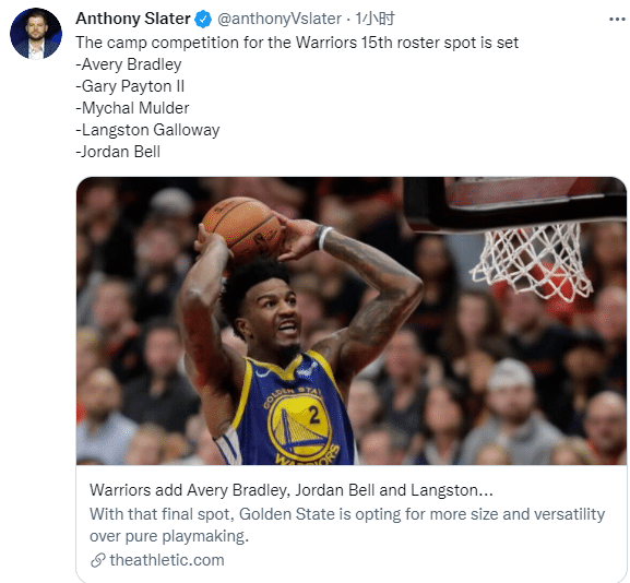 JRS直播网9月25日讯,勇士已经签约湖人旧将,据名记shams报道,布拉德利已经同意加盟勇士,填补了勇士最后一个训练营名额,他将竞争球队大名单空缺的第15人位置;勇士已经官宣签约布拉德利、加洛韦和乔丹-贝尔,配文:让我们一起工作吧,训练营的名单已经确定。