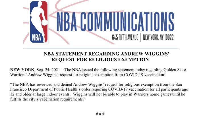 JRS直播网9月25日讯NBA官方已经拒绝了维金斯以宗教为由拒绝接种疫苗的请求,旧金山当地规定12岁及以上的人必须接种疫苗才能进入大通中心球馆,NBA官方还在声明中提到:除非维金斯接种疫苗,否则他无法参加勇士主场的比赛。