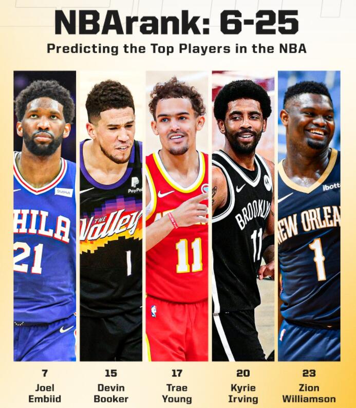 第6-25名的排名分别为:6、约基奇;7、恩比德;8、利拉德;9、戴维斯;10、哈登;11、比尔,12、乔治;13、保罗;14、塔图姆;15、布克;16、巴特勒;17、特雷杨;18、米切尔;19、米德尔顿;20、欧文、21、阿德巴约;22、霍乐迪;23、锡安;24、唐斯;25、戈贝尔。