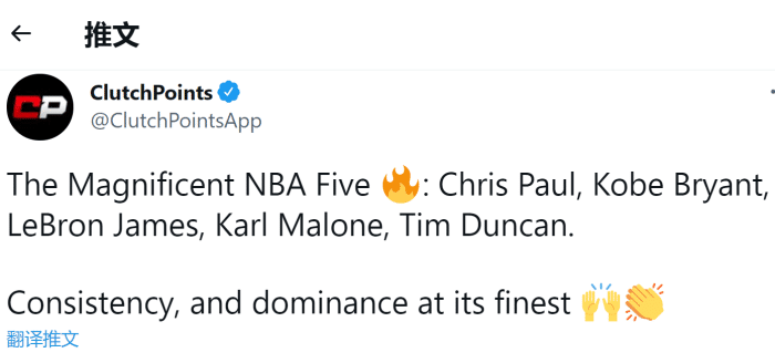 巧合的是,这5大巨星刚好可以组成一套首发阵容,邓肯虽然被誉为历史第一大前锋,但生涯也有不少的时间打中锋位置。另外,这5大巨星还都是攻防一体的巨星,马龙生涯3次入选最佳防守一阵,詹姆斯5次,保罗有7次,邓肯8次,科比9次则是与乔丹、佩顿和加内特并列历史第一。