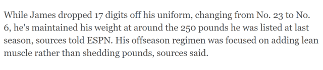 JRS直播网9月24日讯 ,湖人总经理佩林卡表示詹姆斯有所减重,而ESPN随后跟进报道称,所谓的“减重”其实是增肌。詹姆斯目前的体重还和上赛季差不多,都是250磅(约113公斤)左右,据悉他的休赛期计划更多是增添纤细的肌肉,而不是单纯的减少体重。