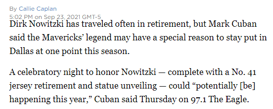 北京时间9月24日,独行侠老板马克-库班透露,球队计划新赛季为德克-诺维茨基举办球衣退役仪式和雕像揭幕仪式,不过诺维斯基庆祝之夜的具体时间还没确定,因为诺天王太忙了。