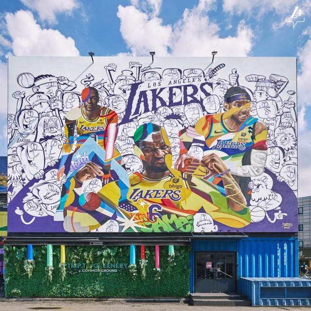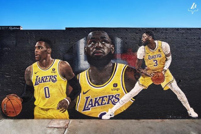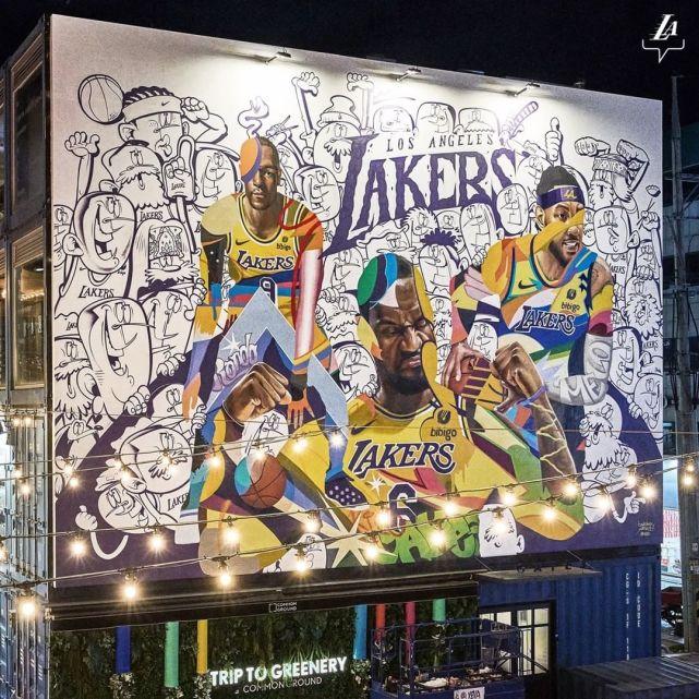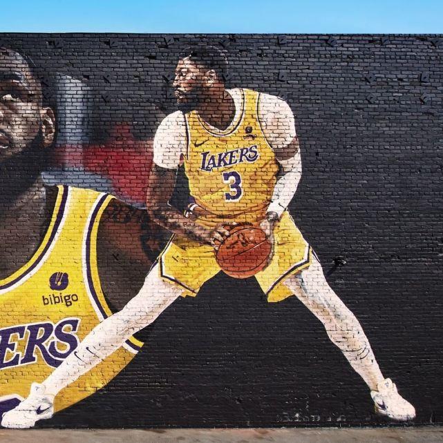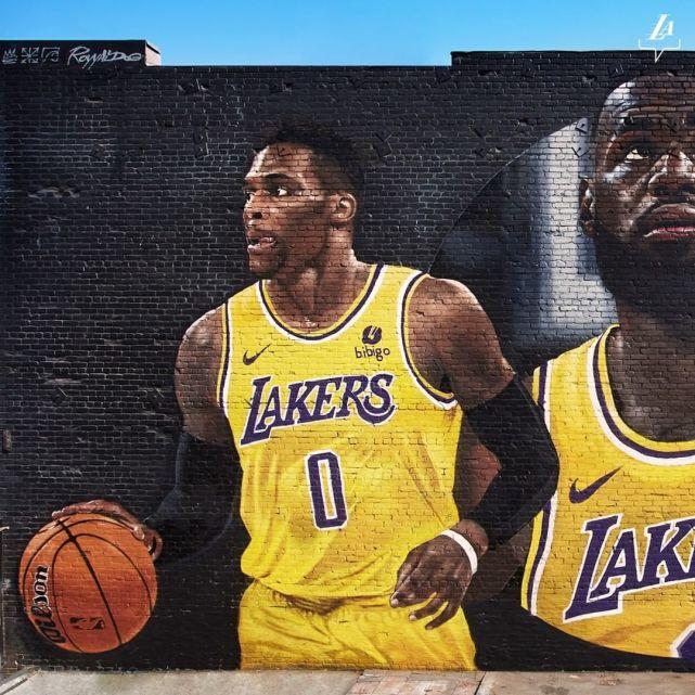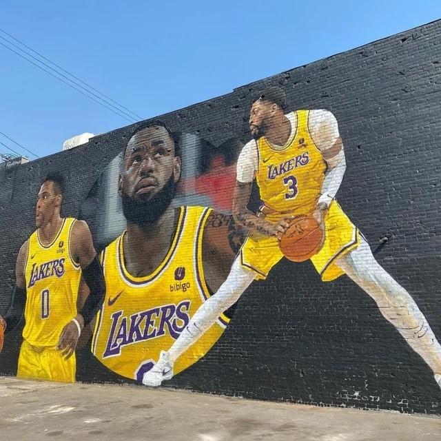位于洛杉矶的这幅壁画,展现的是湖人三巨头的形象。詹姆斯处于C位,目光看向天空。一侧是新援威斯布鲁克,身穿湖人0号球衣,正在运球组织进攻。另一侧是詹姆斯的老搭档浓眉,持球撤步准备出手。湖人是西部冠军的头号热门,也被看好和篮网竞争新赛季的总冠军。