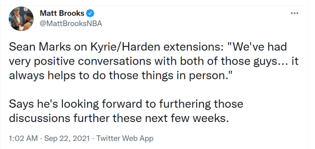 JRS直播网9月22日讯 ,篮网官方召开新赛季发布会,总经理马克斯和主教练纳什一起出席,回答媒体的提问。在这次发布会上,两人谈到了新赛季的方方面面,透露了哈登欧文续约新进展,并表示杜兰特会在新赛季打多个位置。
