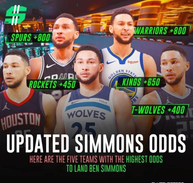 最新的西蒙斯下家赔率显示,森林狼(+400)排名第一,火箭(+450)位居第二。排名第三的是国王(+650),勇士和马刺同为+800,并列第四。