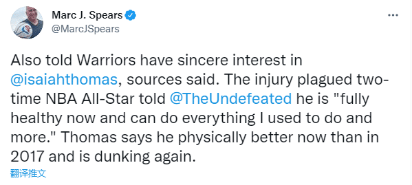 名记MarcJ.Spears还报道,勇士对以赛亚-托马斯有着浓厚的兴趣。此前接受采访时,以赛亚-托马斯也谈到了自己的身体状态:我现在完全健康,可以做我以前做过所有事情,甚至更多。我现在的身体状况比2017年更好,我甚至可以重新扣篮了。