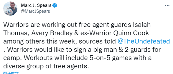 JRS直播网9月21日讯 ,根据名记MarcJ.Spears报道,勇士将在本周试训以赛亚-托马斯、埃弗里-布拉德利和奎因-库克三名后卫,该记者还表示勇士希望签下一名大个子和两名后卫。