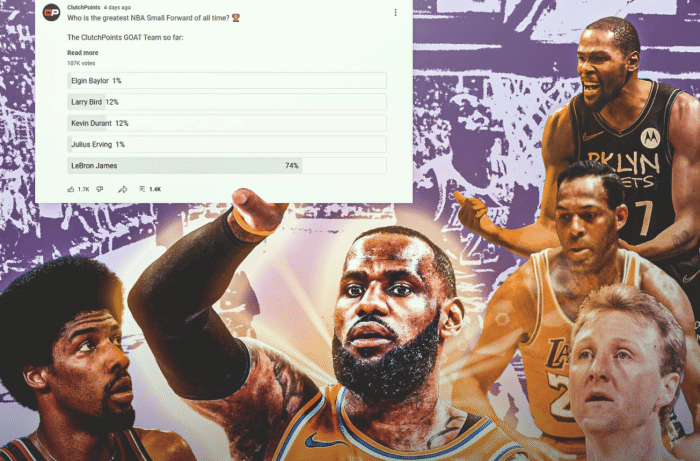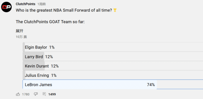 JRS直播网9月20日讯 近日,知名体育媒体ClutchPoints在社媒上向球迷们发起了一项投票,询问谁是NBA历史上最伟大的小前锋。一共有5名候选人入围,分别是勒布朗詹姆斯、拉里伯德、凯文杜兰特、埃尔金贝勒以及朱利叶斯欧文。