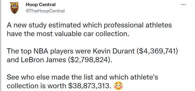 JRS直播网9月19日讯 ,美媒ManySpins公布了NBA现役球员的豪车价值榜。在NBA现役球员中,杜兰特拥有8辆豪车,总价值436万美元,位居第一。排名第二的是詹姆斯,他也有8辆豪车,总价值279万美元。
