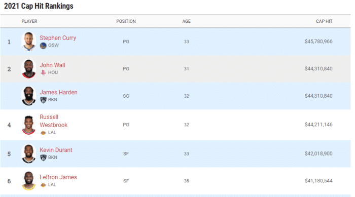 JRS直播网讯 NBA新赛季即将到来,根据知名薪资网站显示,NBA全联盟下赛季一共有31名球员的年薪超过3000万美元,其中库里以4578万美元高居第一位,且连续第5年拿到NBA第一年薪。火箭现球星沃尔和火箭前门面哈登,以4431万美元并列第二,威少、杜兰特、詹姆斯分列四五六位。