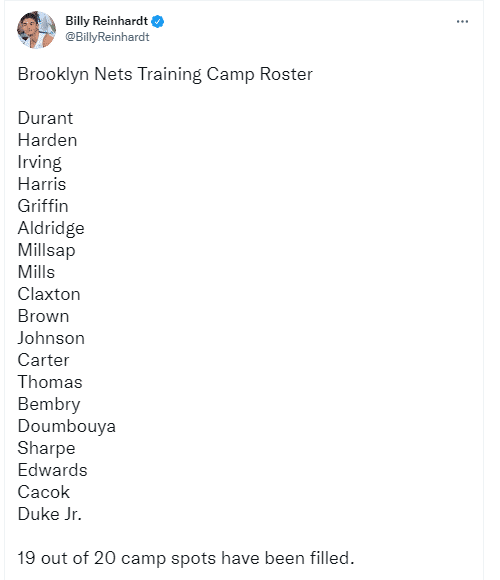 篮网跟队记者Billy Reinhardt随后晒出了训练营的19人名单:杜兰特、哈登、欧文、哈里斯、格里芬、阿尔德里奇、米尔萨普、米尔斯、克拉克斯顿、布朗、詹姆斯-约翰逊、杰文-卡特、托马斯、本布里、敦布亚、夏普、爱德华兹、卡考克和小杜克。他们还可以再签一人,不少球迷建议篮网把名额留给乔-约翰逊,让这位老将试试。 40岁的乔-约翰逊刚刚蝉联了BIG3联赛的MVP。