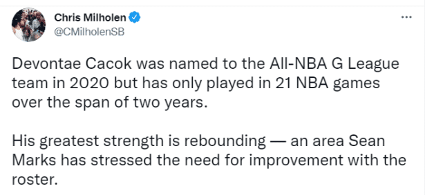 当然,卡考克得到的只是一份Exhibit 10的训练营合同,不能确保留队。这种合同是无保障合同,它允许卡考克被篮网裁掉后加入下属的发展联盟球队,待够至少60天就能获得50000美元的奖金。
