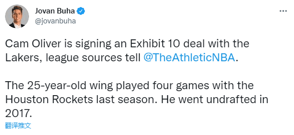 JRS直播网9月17日讯,据TheAthletic记者JovanBuha报道,湖人与卡梅伦-奥利弗签下一份Exhibit10训练营合同;离开NBL并且获得湖人新合同,恭喜2017年落选秀又获得证明自己的机会。