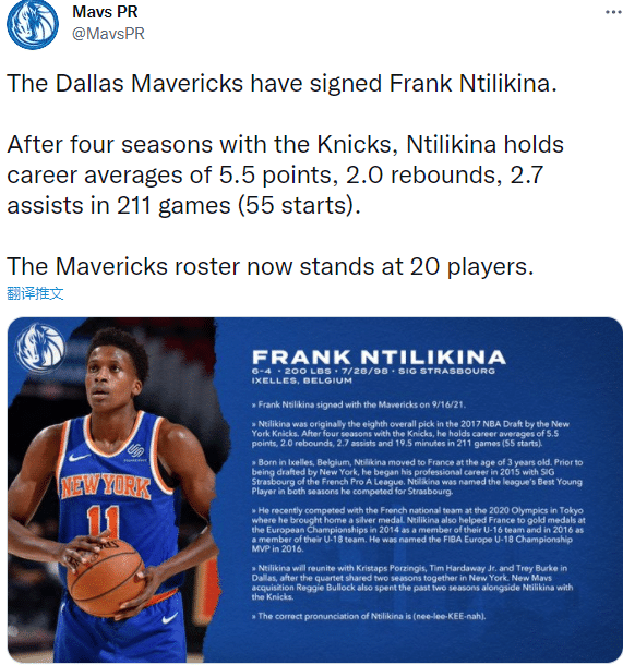 JRS直播网9月17日讯,达拉斯独行侠正式官宣,签约前尼克斯新星尼利基纳,合同细节暂未曝光;独行侠官方写道:球队已经签约弗兰克-尼利基纳,独行侠阵容名单已有20名球员。