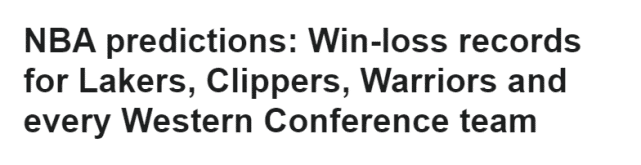 JRS直播网9月16日讯 ,ESPN对西部各队的新赛季战绩进行预测。他们将15支球队分成三个组别,1-6名为总冠军竞争者组,7-10名是附加赛组,余下的5队预计将无缘季后赛。其中,ESPN预测湖人53胜29负,排名西部第二。