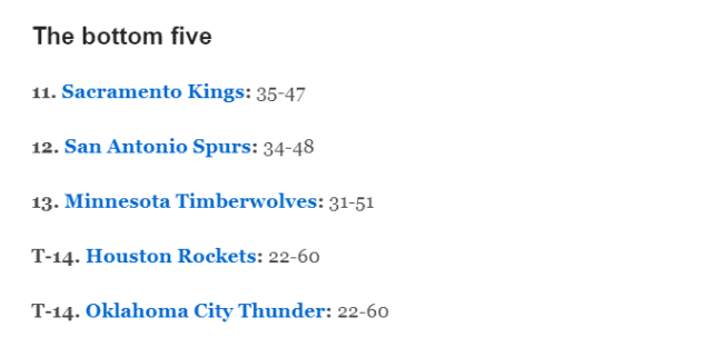 至于西部倒数五名,悬念并不算太大。国王和马刺的实力,基本和上赛季没什么区别。生涯至今球队都打进季后赛的贝弗利,恐怕很难改变森林狼的命运。火箭和雷霆都在重建期,年轻球员会占据大量比赛时间,他们的战绩可能是一起垫底。