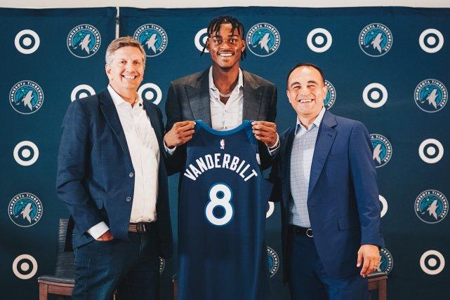 除了贝弗利,森林狼的12号普林斯,6号麦克劳林和8号范德比尔特,也都出现在今天的新闻发布会上,和媒体见面并和球队教练、高层合影。