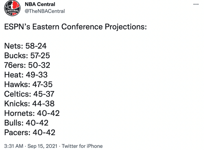 JRS直播网9月15日讯 近日外媒《ESPN》对于新赛季的NBA进行展望,预测东部战绩,其中篮网排名第一,雄鹿力压费城,热火重返前四名,老鹰、凯尔特人和尼克斯这三支上赛季参加季后赛的球队位居身后。黄蜂、公牛和步行者这三支球队将会争夺东部第八名。
