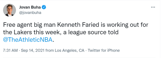 JRS直播网9月14日讯,据The Athletic湖人记者Jovan Buha报道,联盟消息人士透露,自由球员“半兽人”肯尼斯-法里德本周将为湖人进行试训。