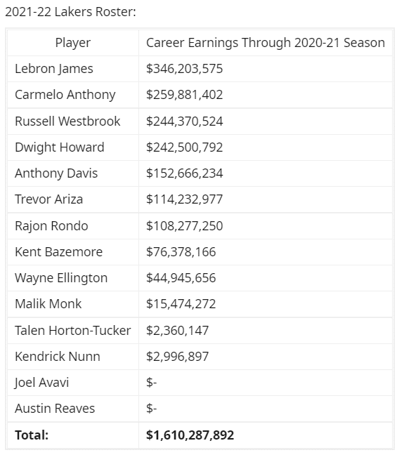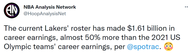 JRS直播网9月13日讯 休赛期,湖人通过一系列运作,打造了一套星光熠熠的豪华阵容。北京时间9月13日,美媒spotrac统计了湖人现有阵容的生涯总收入(只含NBA薪水),累计达到16.1亿美元!这是什么概念,他们还列出了东京奥运的美国男篮阵容生涯总收入(10.8亿美元),这支湖人能超过他们近五成。