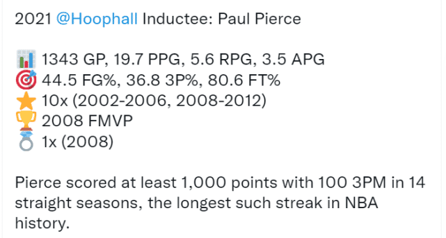JRS直播网9月12日讯,2021届名人堂颁奖典礼举行,保罗-皮尔斯正式成为名人堂的一员。 凯文-加内特是他的引荐人。皮尔斯连续14个赛季至少得到1000分并命中100个三分球,在NBA历史上这是最长的。