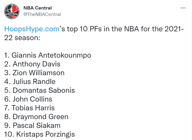 JRS直播网9月11日讯 ,继组织后卫、得分后卫和小前锋之后,知名美媒HoopsHype又公布了新赛季的大前锋排名。雄鹿的字母哥高居第一,湖人的浓眉排名第二。