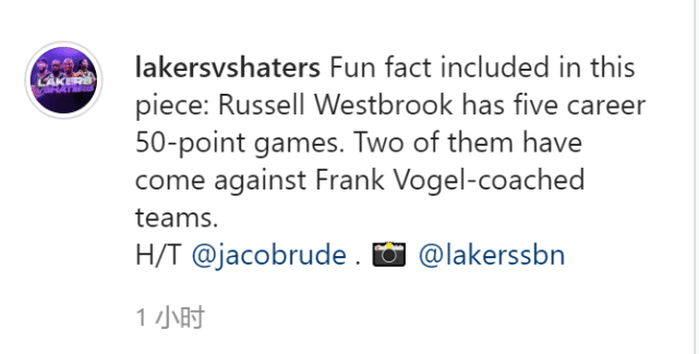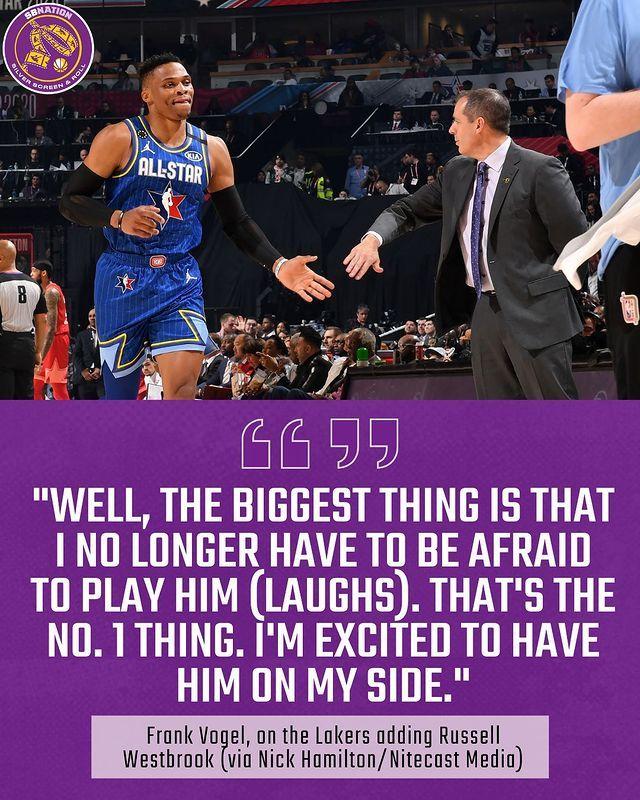 湖人主帅沃格尔也在最近一档节目中提到了威少,言论颇为有趣。沃格尔说道:“好了,最重要的一点是我再也不用害怕和他交手了(哈哈大笑)。那是头等大事,我很兴奋他现在我这一方。”