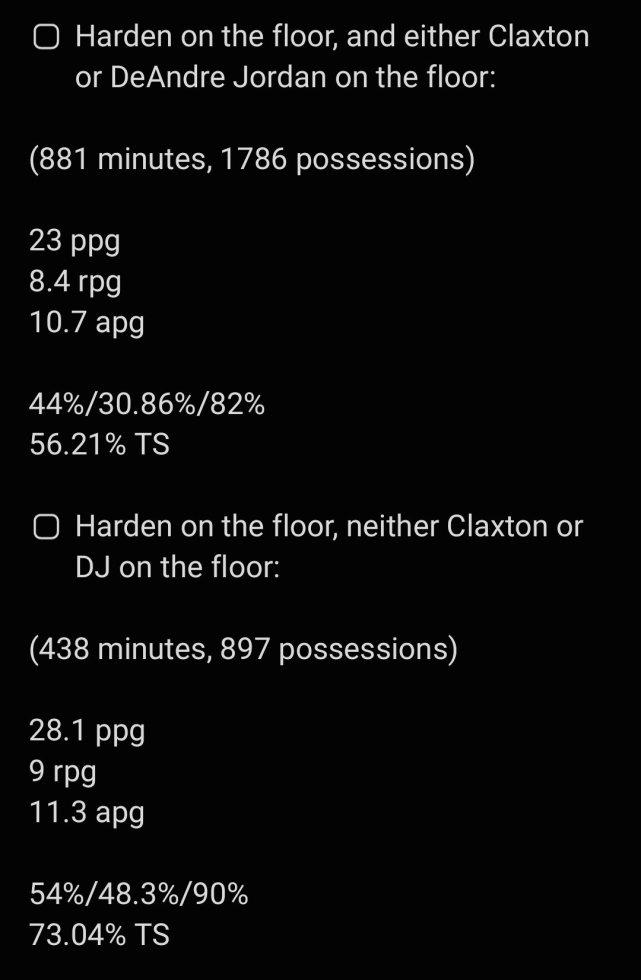 哈登和不能拉开空间的内线同场,确实影响他个人的表现。数据显示,上赛季哈登和小乔丹或者克拉克斯顿同场的881分钟,数据是23分8.4篮板10.7助攻,投篮命中率44%,三分命中率30.86%,真实命中率56.21%。哈登不和两人同场的438分钟,数据是28.1分9篮板11.3助攻,投篮命中率54%,三分命中率48.3%,真实命中率73.04%,美媒评价:天壤之别。