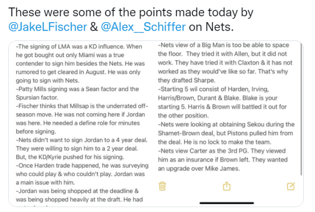 篮网在交易截止日前曾兜售小乔丹,在选秀期间更是加大了谈判交易的力度,外界普遍认为,小乔丹没有交易价值。篮网曾经试图得到梅森-普拉姆利,但没能成功。篮网希望大个子能够拉开空间,他们曾试着让阿伦扮演这样的角色,但不奏效,他们也在尝试克拉克斯顿成为这样的大个子,现在也没成功(注:克拉克斯顿休赛期已经在练三分球)。这也是篮网今年在选秀大会上选择夏普的原因。