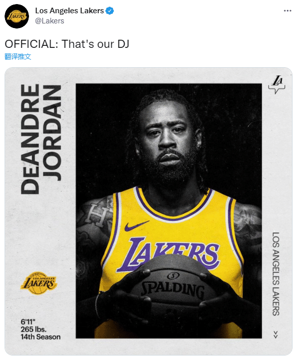 JRS直播网9月10日讯 ,篮网旧将小乔丹正式签约湖人,洛杉矶湖人已经官宣引援这位全明星中锋,晒照并配文:这是我们的DJ(小乔丹名字的缩写);此前小乔丹被篮网交易离队,和活塞达成买断后加盟湖人,新赛季他将辅佐湖人三巨头冲击总冠军。