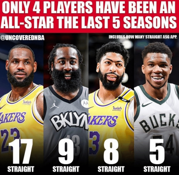 JRS直播网9月09日讯 能够入选NBA全明星阵容的球员,实力自然属于联盟顶级行列。不少NBA运动员,能够入选一次都非常不易。如若可以多次入选,那自然是不小的成就。那么现役球员中,在过去五年都能连续入选NBA全明星的都有谁?美媒近日也是进行一番统计,符合条件的现役球员只有四人,而这其中湖人就占了两人。杜兰特库里两大超巨无缘。