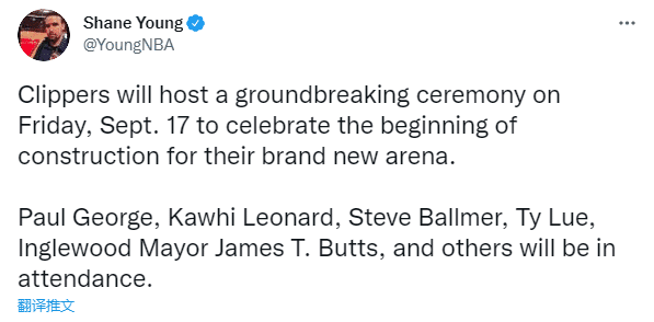 JRS直播网9月09日讯 ,据NBA记者Shane Young报道,快船将于9月18日为他们的新球馆举行奠基仪式;届时出席活动的阵容十分豪华——快船老板鲍尔默,快船主教练泰伦-卢,球星保罗-乔治、莱昂纳德,还有洛杉矶英格尔伍德市长等人都将会出席奠基仪式。